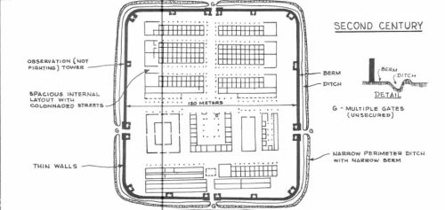 In the second century, a Roman fort had multiple, open gates, thin walls, observation (not fighting) towers, and a spacious interior with colonnaded streets.  Apparently, when  a fort’s gates were elaborate, they served only to make a grand impression and had no overt defensive purpose. (A few years living in Italy convinced me that such grand-looking but otherwise useless gates had survived into our own times on Italian farmhouses).