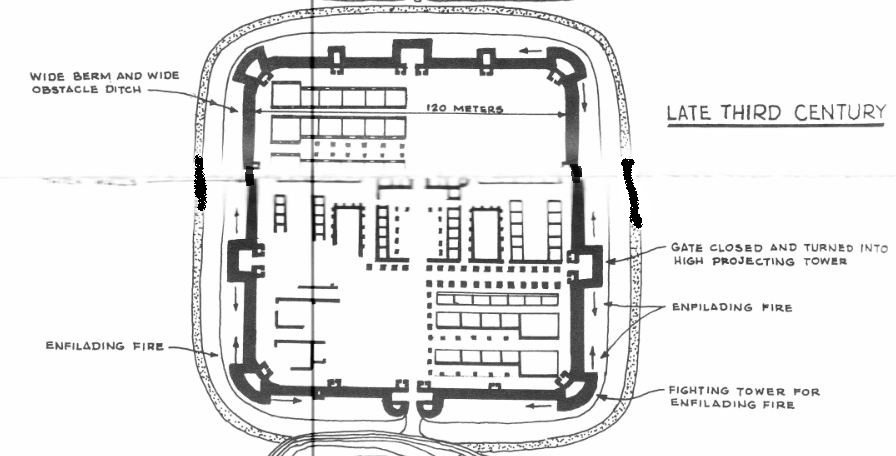 One hundred years later, by the late 4th century, Roman forts had become proto-castles.  They had been relocated to higher, “more defensible”, ground.  The once proud and welcoming Roman gates had dwindled to one elaborately defensive structure, plus a postern gate (i.e. a narrow slit valuable for quick counter-attacks and for receiving informers).  Towers on these forts had multiplied, but only to ensure enfilading fire against besiegers.  The spacious interior colonnades of of the Roman fort of two centuries before had become cramped troop quarters jumbled in irregular shapes.  It is clear from this design that what was once called the Dark Ages had begun.