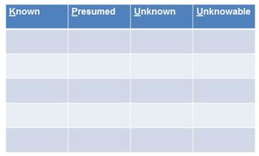Once the KPUU framework creates an explicit, shared inventory of knowledge about the present, including embedded assumptions, then the question of what it all means (implications) can be asked (we also have frameworks for this process, which we will share in later posts).